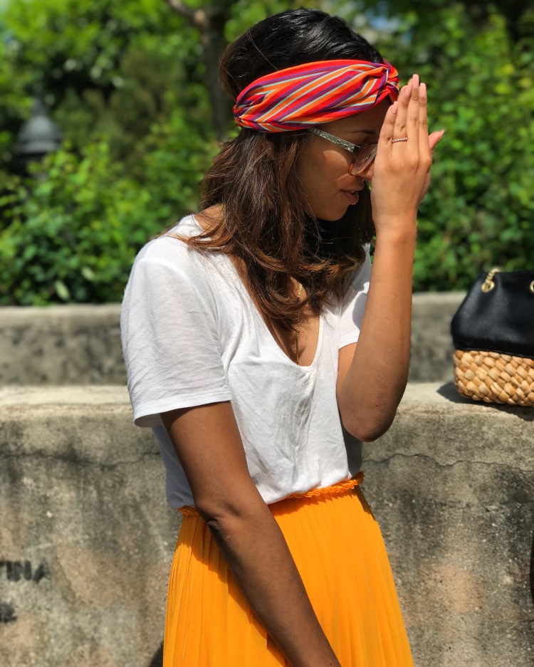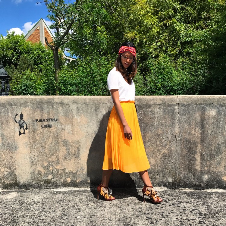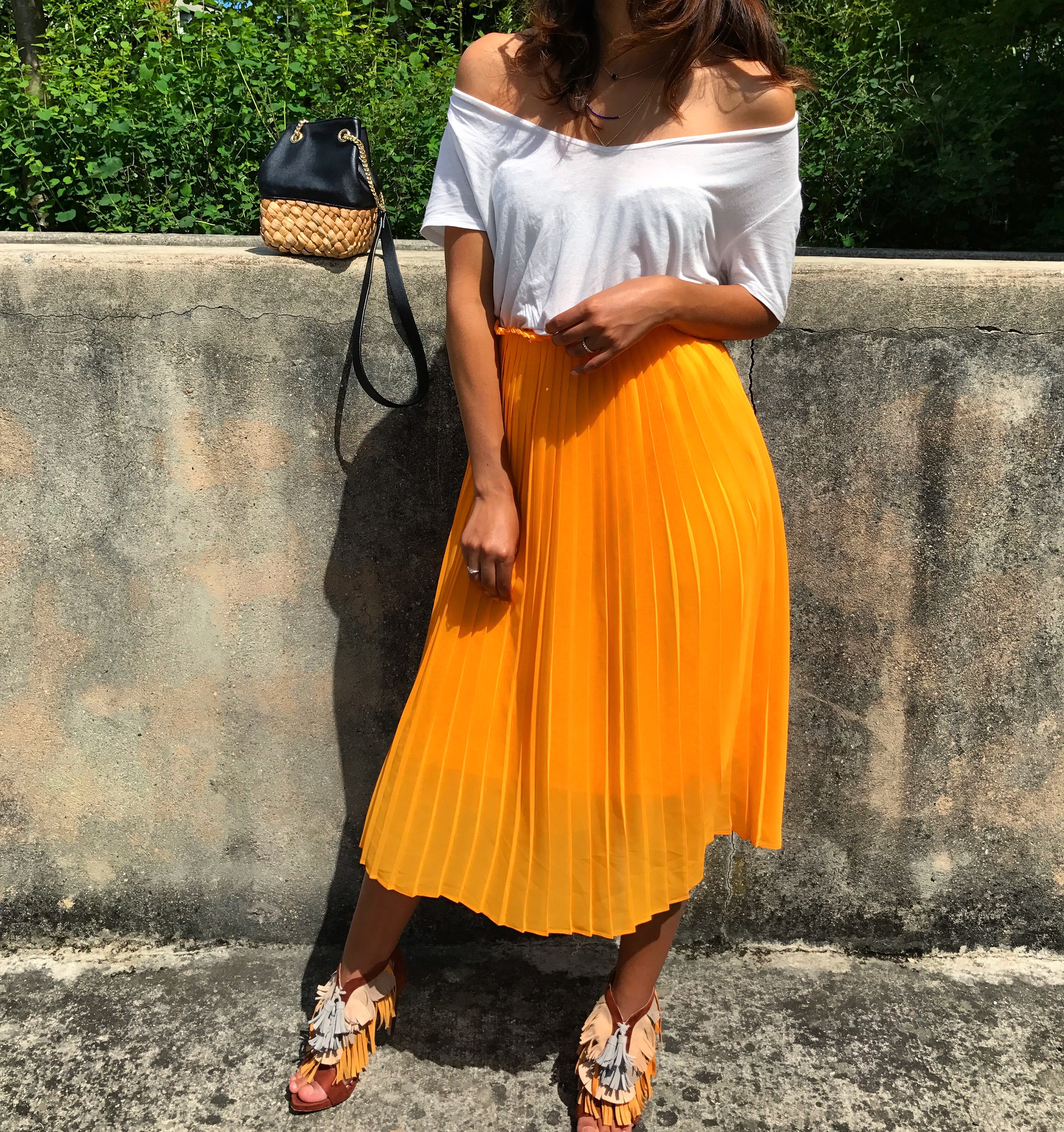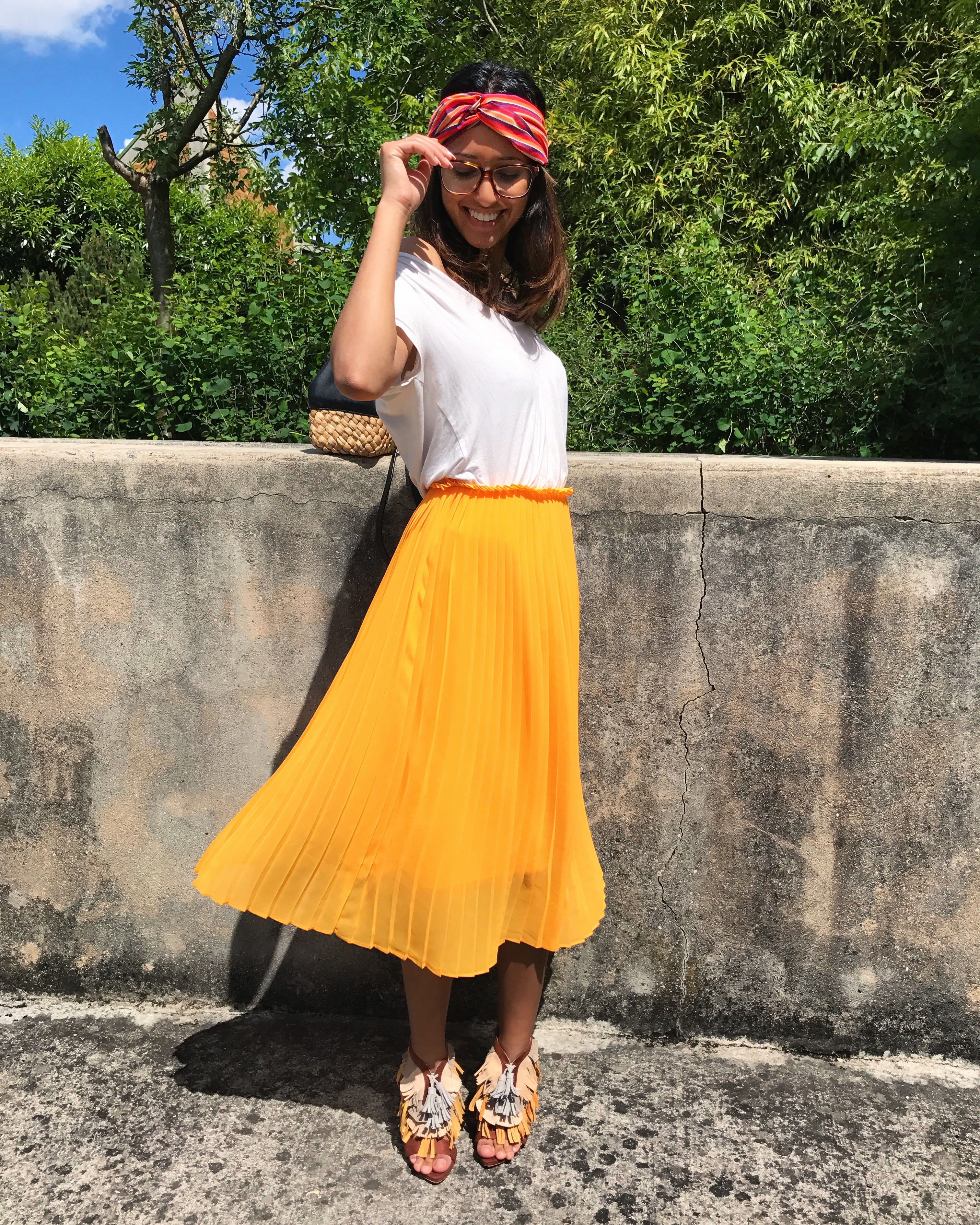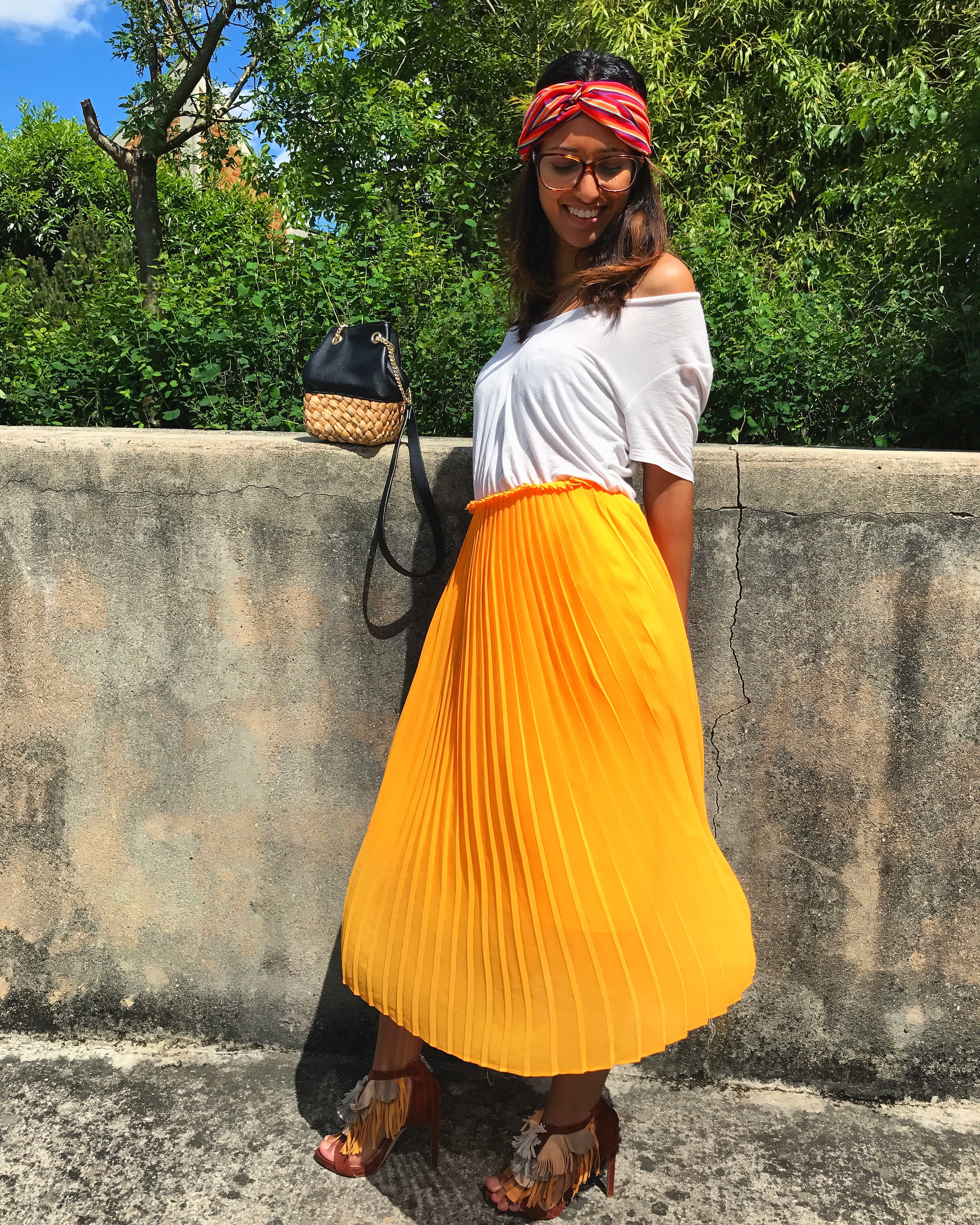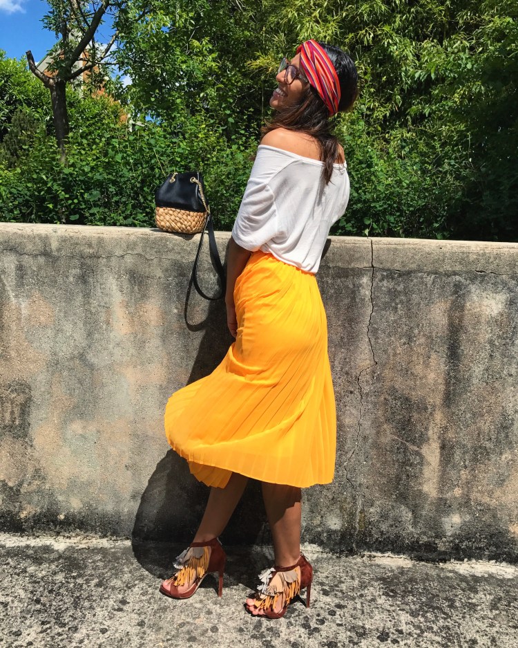Côté mode, enfiiiin l’été : les couleurs vives, les coupes originales, les épaules nues et le teint tout frais. J’ai opté ici pour une tenue simplisme : Une jupe plissée, incontournable depuis des années elle va à tout le monde donc ne vous privez pas ! Je l’assemble avec un t shirt blanc porté aux épaules et mes talons old old old à franges de chez Zara parfaits pour le printemps. Cet été, vous risquez aussi de voir énormément ces petits bandeaux sur ma tête qui, en plus d’être de toute beauté, me protègeront des insolations et de mes allergies. AH OUI, parce que je ne vous l’ai pas dit mais la petite amoureuse du soleil que je suis …. y est un peu allergique 😂😂😂. Si c’est pas un coup du destin …