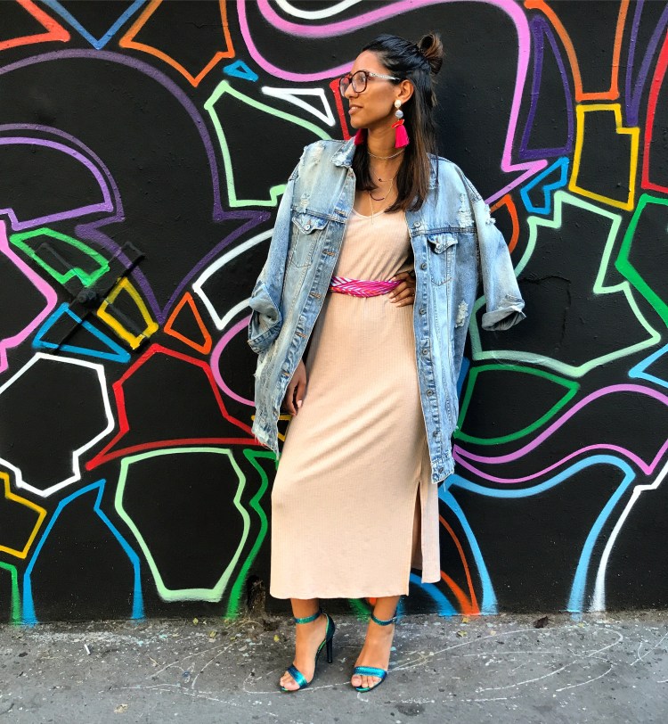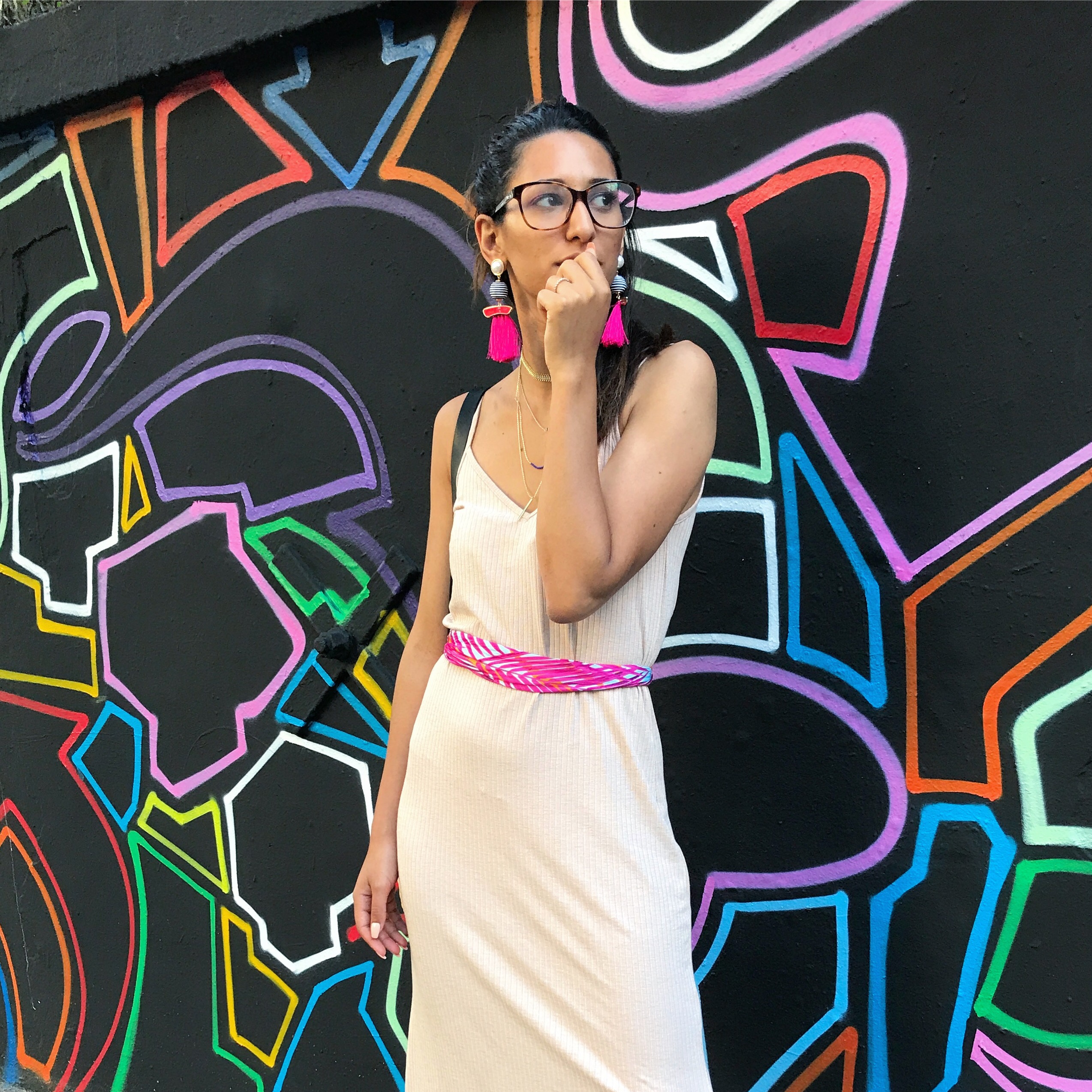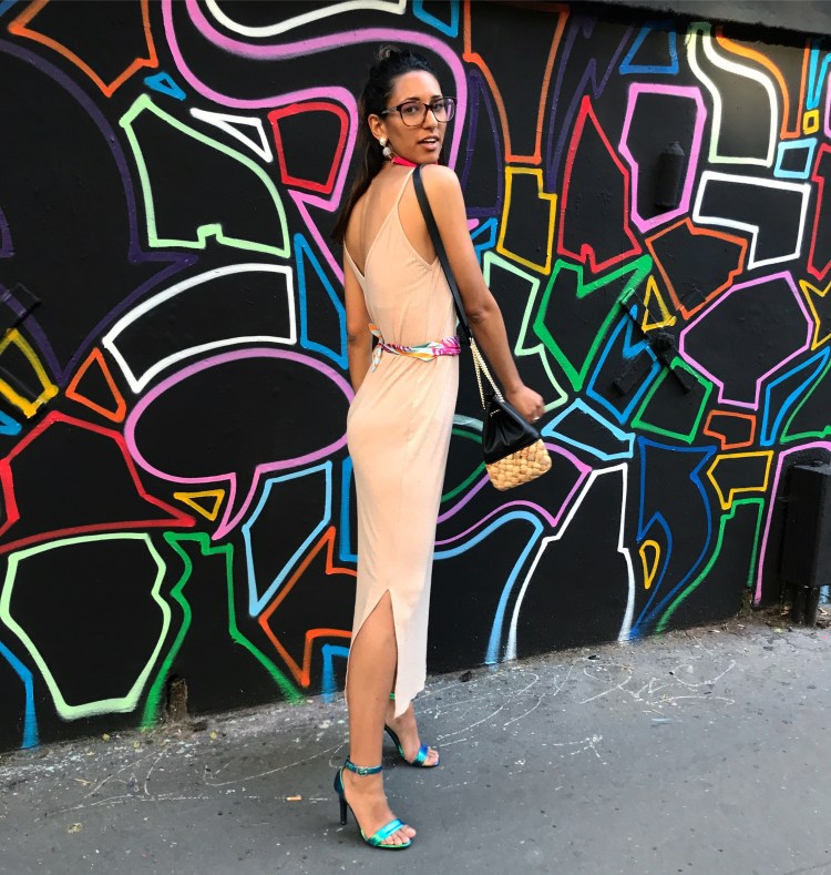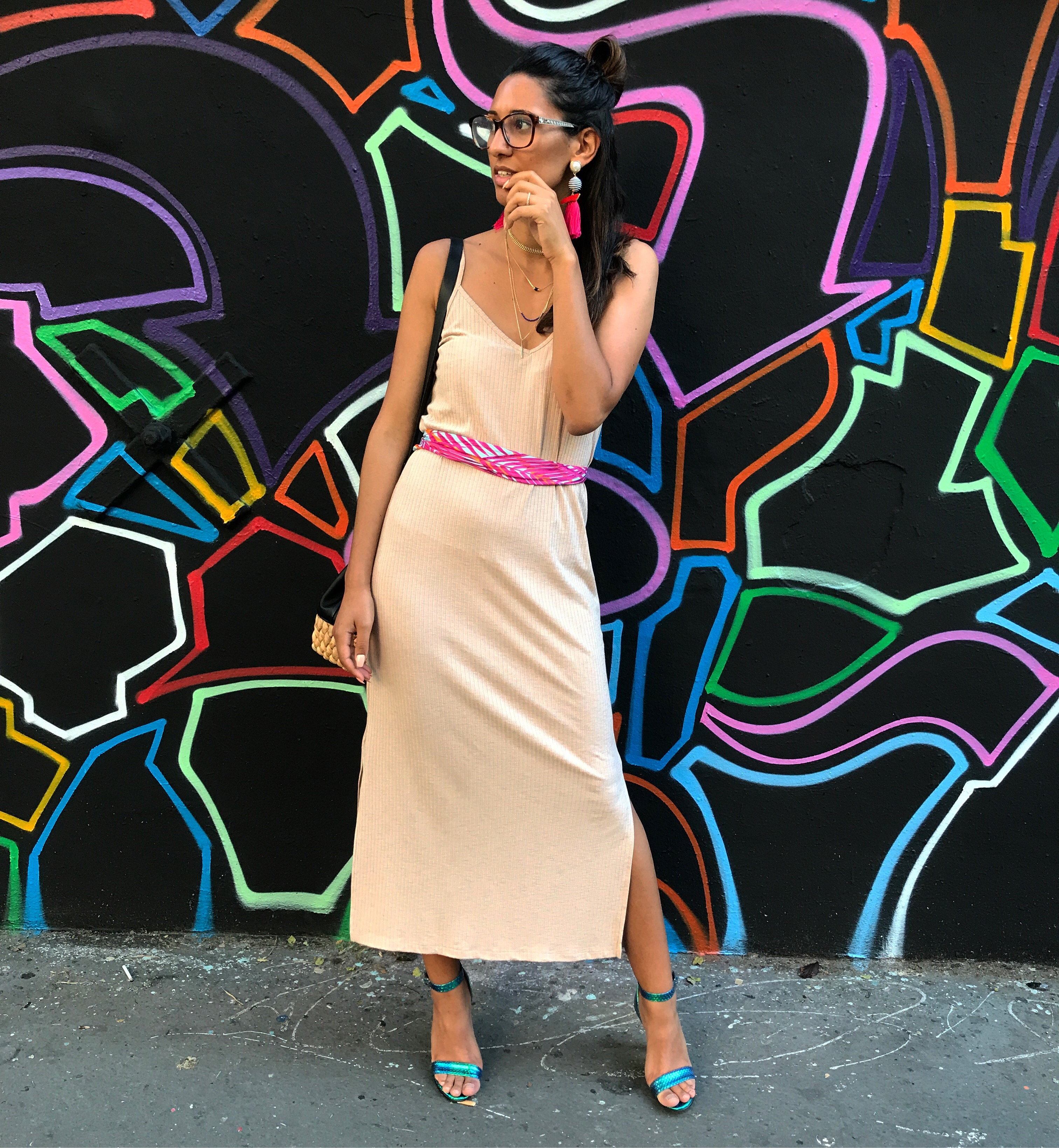 J’ai pris cette robe Bershka hyper simple que toutes les enseignes font tous les étés et que j’ai depuis l’an dernier ! Bien taillée, légère et d’une longueur que j’affectionne particulièrement je savais que c’était ça que je porterai. Comment accessoiriser une tenue toute simple ? Dans mon cas j’y ai juste ajouté un foulard de ceux que vous trouvez absolument partout en ce moment autour de Ma taille. J’ai accompagné le tout d’une super grosse paire de boucles d’oreilles hyper colorées et d’une paire de talon encore une fois hyper colorées. Ceux que je porte viennent de chez Primark que j’ai depuis 2 ans, ils ne m’ont rien coûté (pas plus de 12€) et c’est tout ! Donc 20 petits euros d’investissement et vous avez l’impression d’avoir unennoyvrllr tenue de lumières !