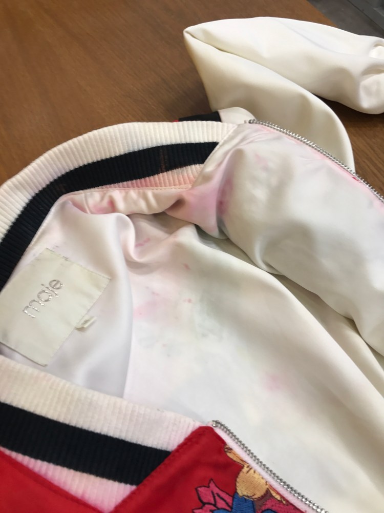 Qu elle n’a pas été mon horreur absolue quand je suis allée la chercher et que j’ai découvert que les couleurs avaient bavé PARTOUT. Bien sûr il y a plus grave dans la vie. Bien sûr ce n’est que matériel en plus vous me connaissez je ne suis pas tres très attachée à ce que je possède. Je n’ai pas trop de probleme à me séparer de mes biens. Mais là c’était plus que ça. Là c’était les semaines de patience, la prise de décision, le fait de mettre beaucoup d’argent dans une veste que je n’avais porté que quelques heures.