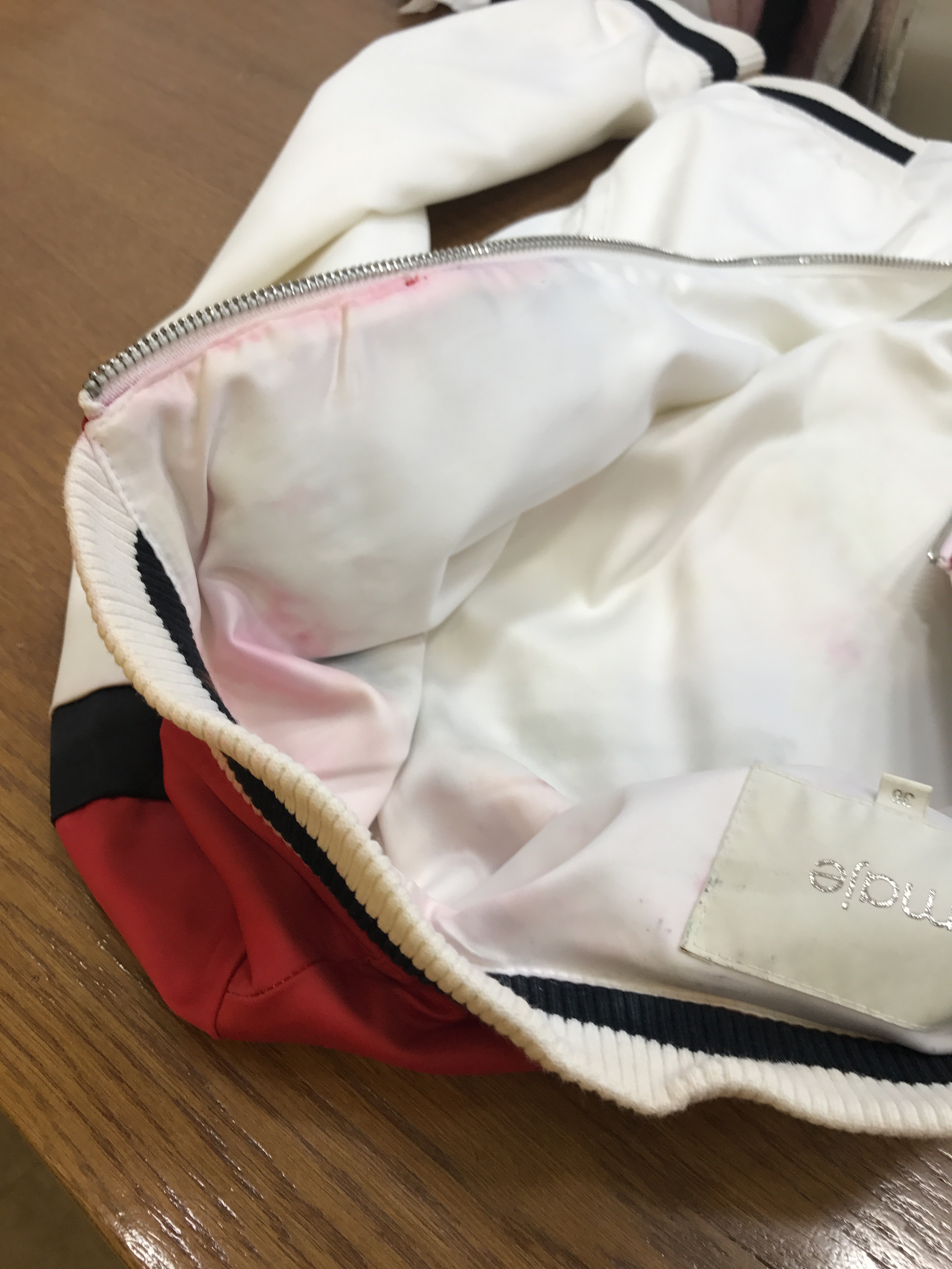 Qu elle n’a pas été mon horreur absolue quand je suis allée la chercher et que j’ai découvert que les couleurs avaient bavé PARTOUT. Bien sûr il y a plus grave dans la vie. Bien sûr ce n’est que matériel en plus vous me connaissez je ne suis pas tres très attachée à ce que je possède. Je n’ai pas trop de probleme à me séparer de mes biens. Mais là c’était plus que ça. Là c’était les semaines de patience, la prise de décision, le fait de mettre beaucoup d’argent dans une veste que je n’avais porté que quelques heures.